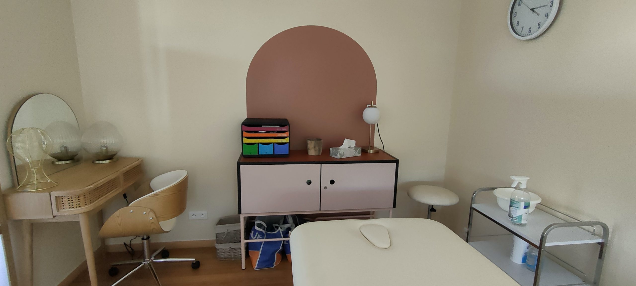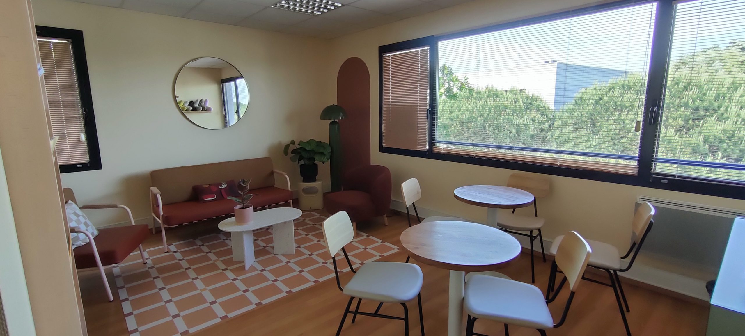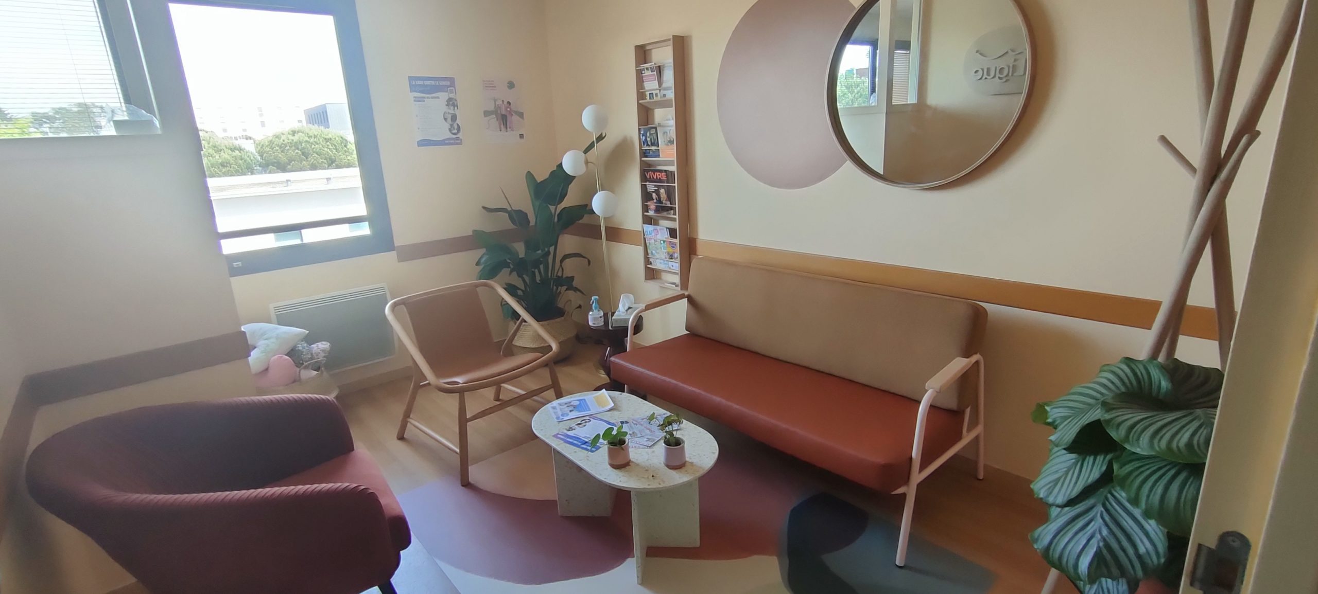 Salle d’attente ; salon pour se rencontrer, échanger, participer à des activités ; cabine esthétique… tout a été refait dans des tons crème, marron, terracotta, assorti à du mobilier en bois clair. Un cocon doux, chaleureux, convivial et dans l’air du temps.